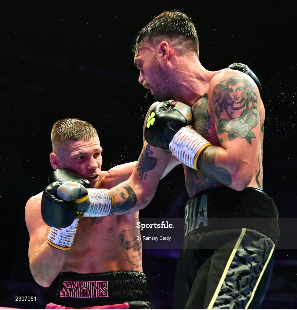6 August 2022; Tyrone McKenna, right, and Chris Jenkins during their welterweight bout at SSE Arena in Belfast. Photo by Ramsey Cardy/Sportsfile