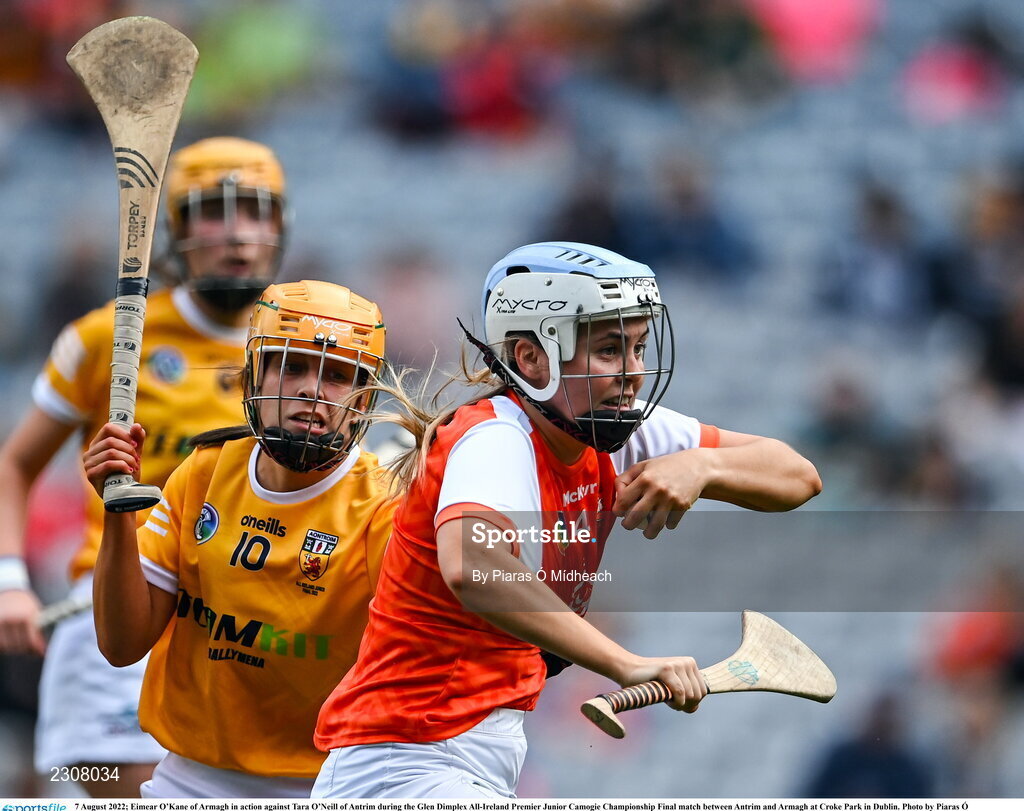 7 August 2022; Eimear O’Kane of Armagh in action against Tara O’Neill of Antrim during the Glen Dimplex All-Ireland Premier Junior Camogie Championship Final match between Antrim and Armagh at Croke Park in Dublin. Photo by Piaras Ó Mídheach/Sportsfile