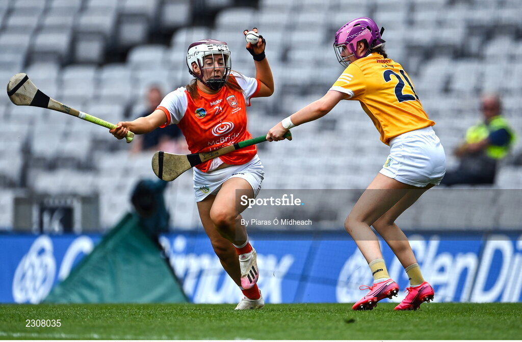 7 August 2022; Eimear Smyth of Armagh in action against Nuala Devlin of Antrim during the Glen Dimplex All-Ireland Premier Junior Camogie Championship Final match between Antrim and Armagh at Croke Park in Dublin. Photo by Piaras Ó Mídheach/Sportsfile