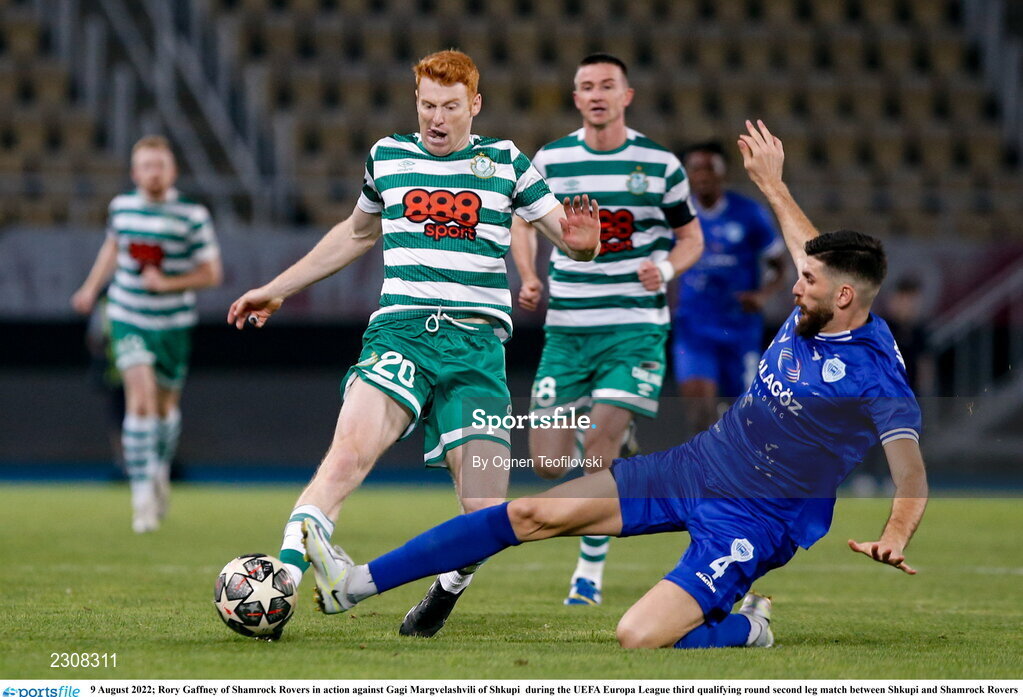 9 August 2022; Rory Gaffney of Shamrock Rovers in action against Gagi Margvelashvili of Shkupi during the UEFA Europa League third qualifying round second leg match between Shkupi and Shamrock Rovers at Arena Todor Proeski in Skopje, North Macedonia. Photo by Ognen Teofilovski/Sportsfile
