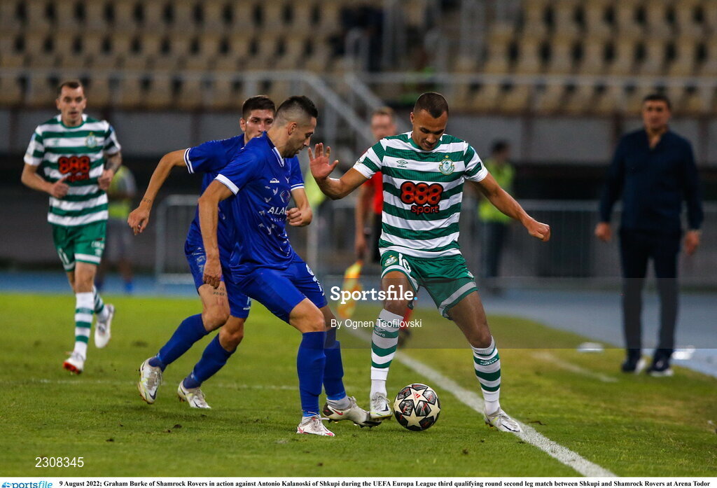 9 August 2022; Graham Burke of Shamrock Rovers in action against Antonio Kalanoski of Shkupi during the UEFA Europa League third qualifying round second leg match between Shkupi and Shamrock Rovers at Arena Todor Proeski in Skopje, North Macedonia. Photo by Ognen Teofilovski/Sportsfile