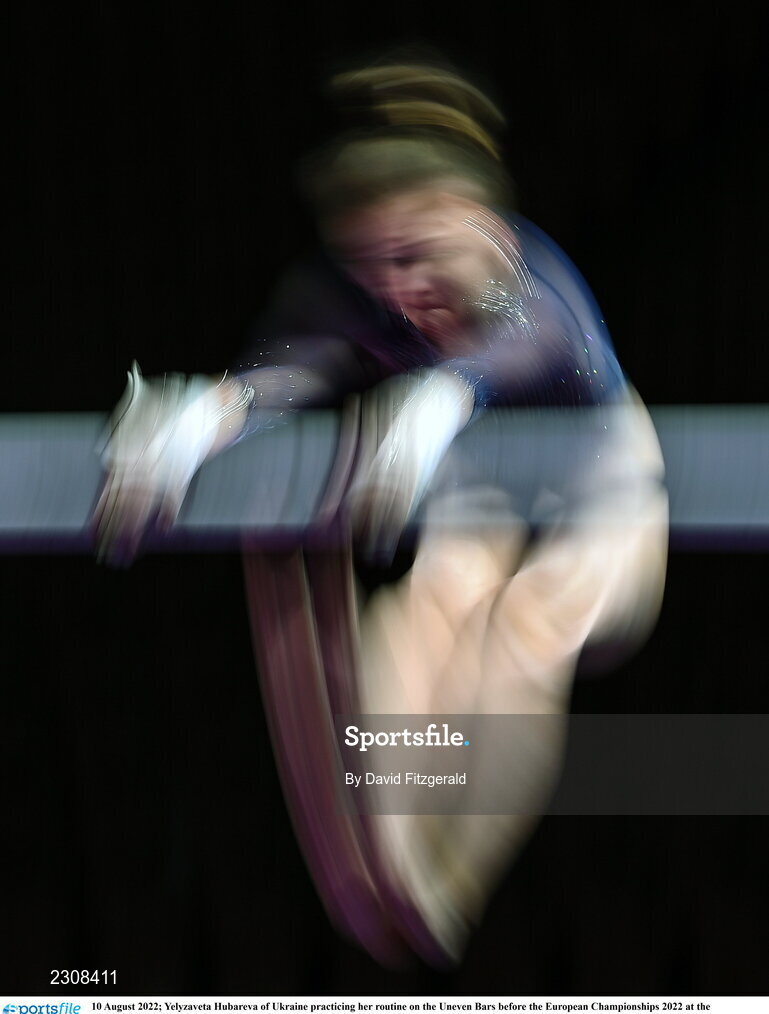 10 August 2022; Yelyzaveta Hubareva of Ukraine practicing her routine on the Uneven Bars before the European Championships 2022 at the Olympiahalle in Munich, Germany. Photo by David Fitzgerald/Sportsfile