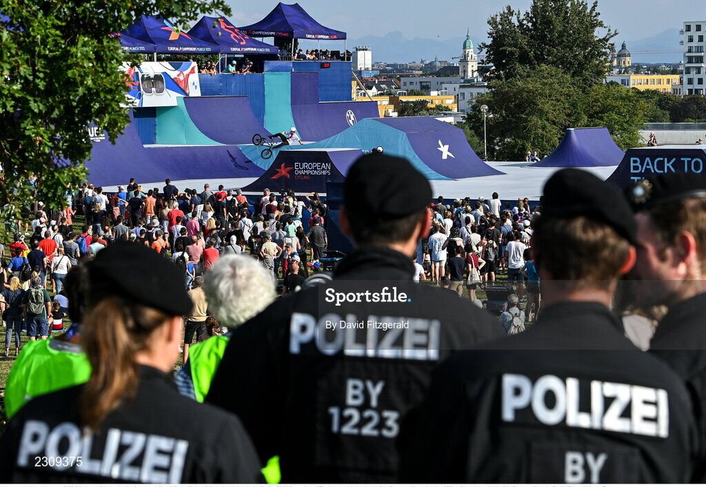 11 August 2022; Members of the local police force watch Patryk Teul of Poland falls during his heat in the Cycling BMX Freestyle qualification round during day 1 of the European Championships 2022 at Olympiaberg in Munich, Germany. Photo by David Fitzgerald/Sportsfile