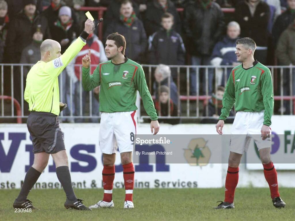 9 December 2006; Willo McDonagh, Glentoran, argues with referee Mark Courtney as he shows the yellow card to Gary Smyth. Carnegie Premier League, Crusaders v Glentoran, Seaview, Belfast. Picture credit: Russell Pritchard / SPORTSFILE