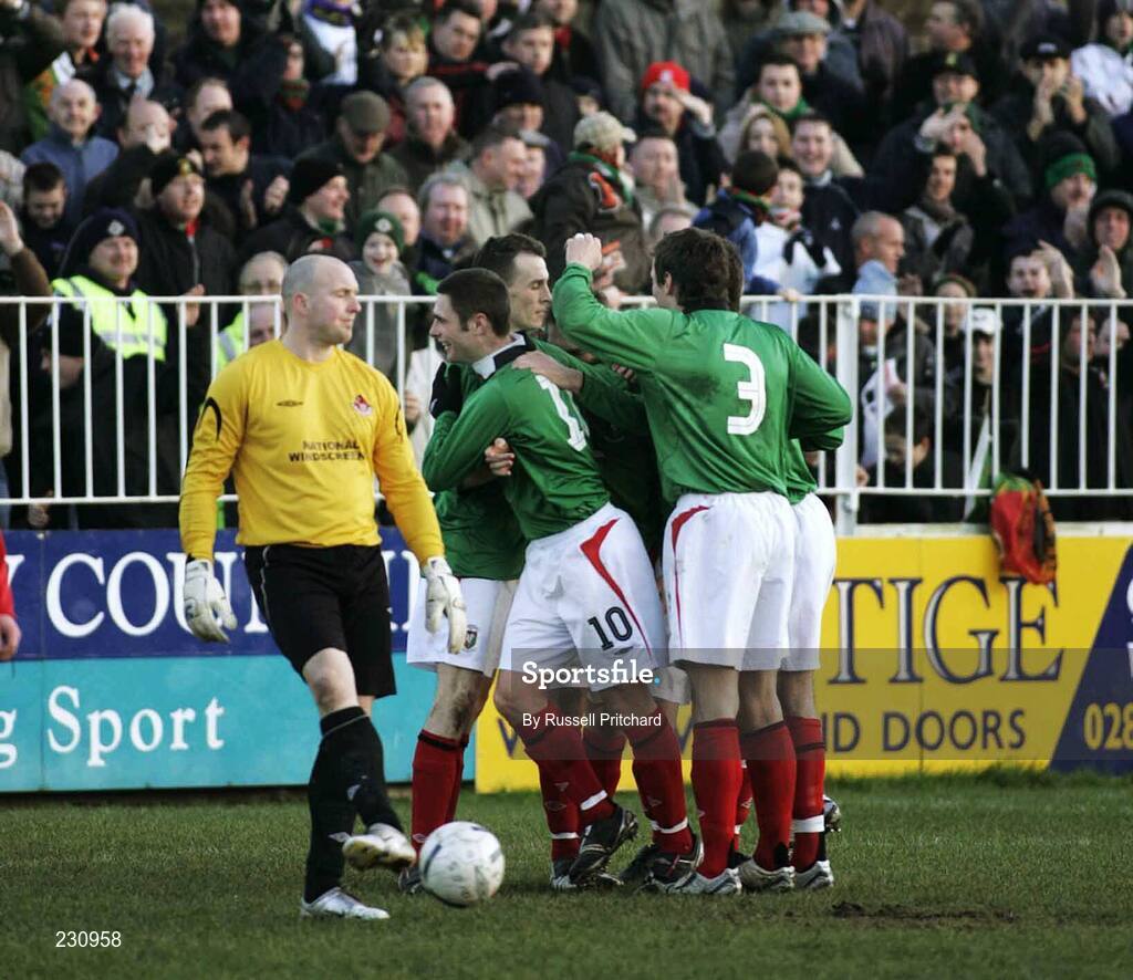 9 December 2006; Crusaders goalkeeper Neil Armstrong kicks the ball while Gary Hamilton celebrates his goal with team mates. Carnegie Premier League, Crusaders v Glentoran, Seaview, Belfast. Picture credit: Russell Pritchard / SPORTSFILE