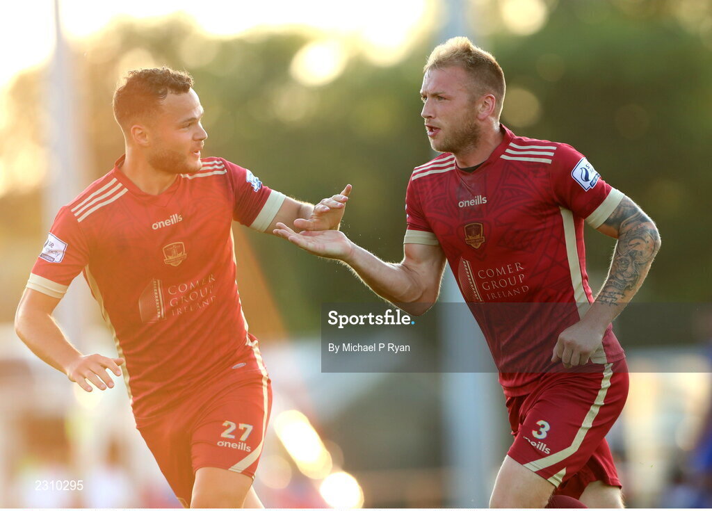 12 August 2022; Stephen Walsh of Galway United, right, celebrates after scoring his side's first goal with team-mate Max Hemmings during the SSE Airtricity League First Division match between Waterford and Galway United at RSC in Waterford. Photo by Michael P Ryan/Sportsfile