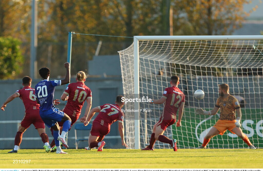 12 August 2022; Roland Idowu of Waterford shoots to score his side's first goal during the SSE Airtricity League First Division match between Waterford and Galway United at RSC in Waterford. Photo by Michael P Ryan/Sportsfile