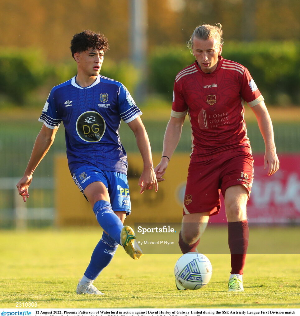 12 August 2022; Phoenix Patterson of Waterford in action against David Hurley of Galway United during the SSE Airtricity League First Division match between Waterford and Galway United at RSC in Waterford. Photo by Michael P Ryan/Sportsfile