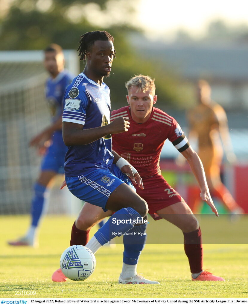 12 August 2022; Roland Idowu of Waterford in action against Conor McCormack of Galway United during the SSE Airtricity League First Division match between Waterford and Galway United at RSC in Waterford. Photo by Michael P Ryan/Sportsfile