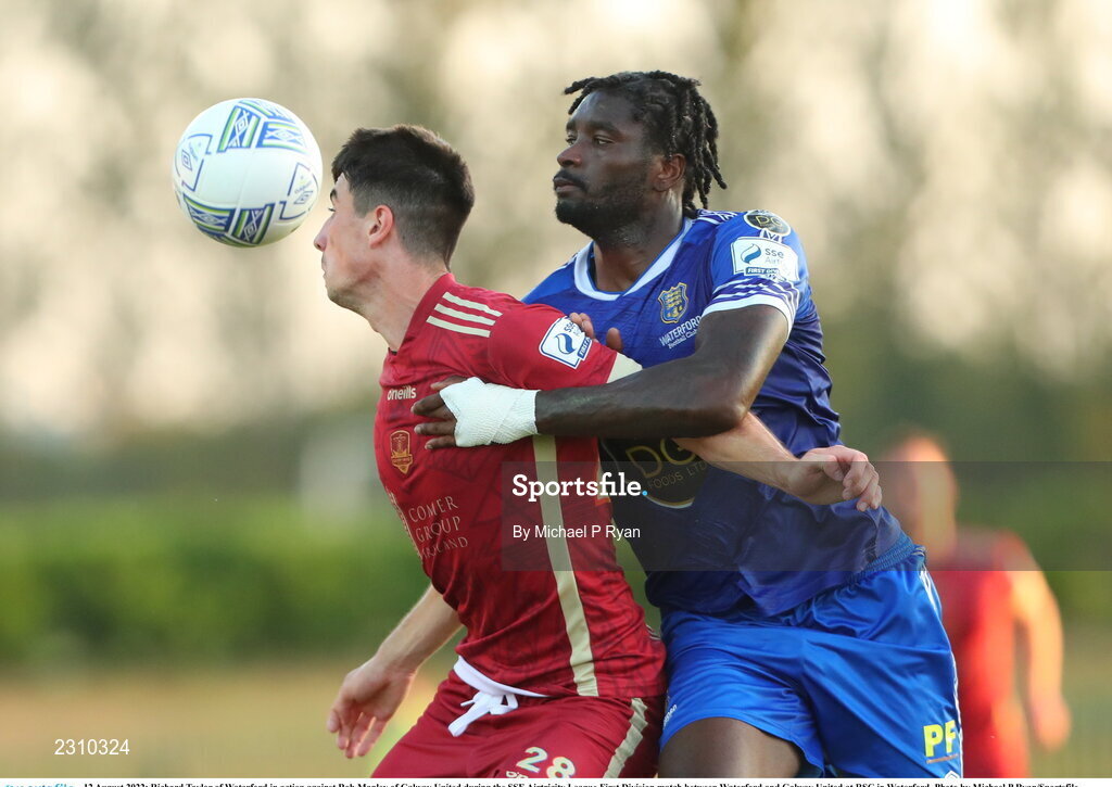 12 August 2022; Richard Taylor of Waterford in action against Rob Manley of Galway United during the SSE Airtricity League First Division match between Waterford and Galway United at RSC in Waterford. Photo by Michael P Ryan/Sportsfile