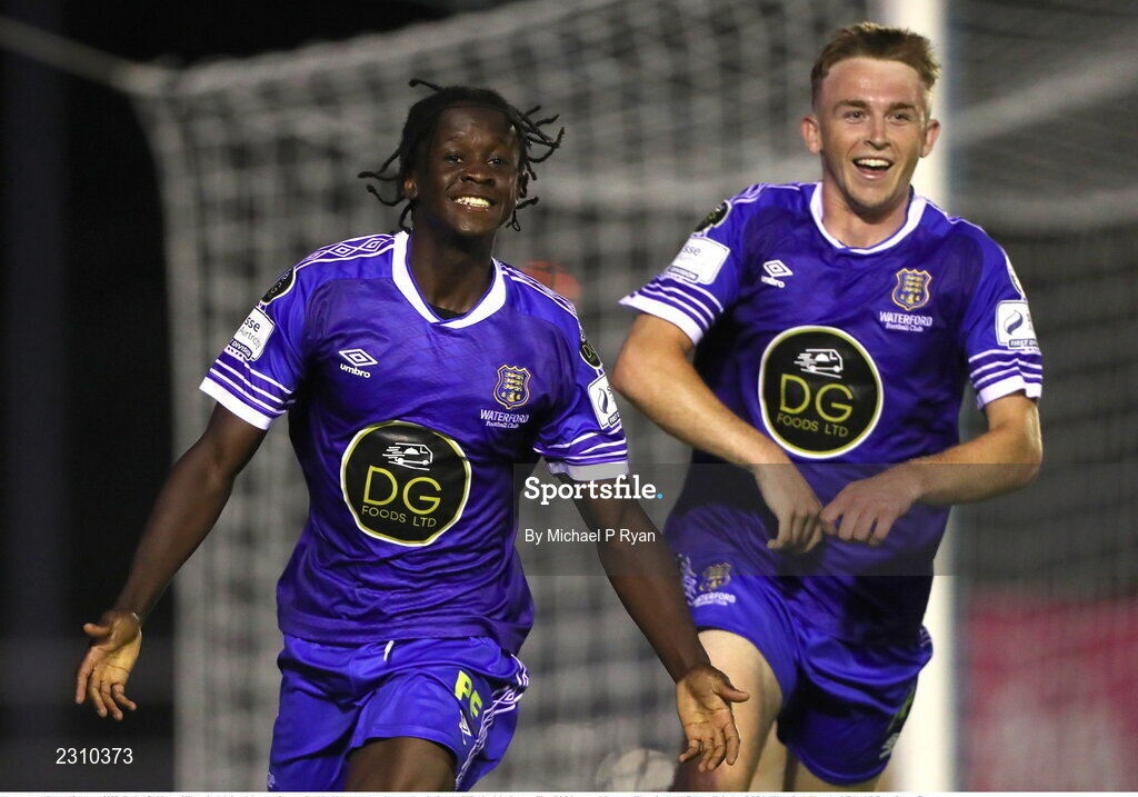 12 August 2022; Junior Quitirna of Waterford, left, celebrates after scoring his side's second goal, a penalty, during the SSE Airtricity League First Division match between Waterford and Galway United at RSC in Waterford. Photo by Michael P Ryan/Sportsfile