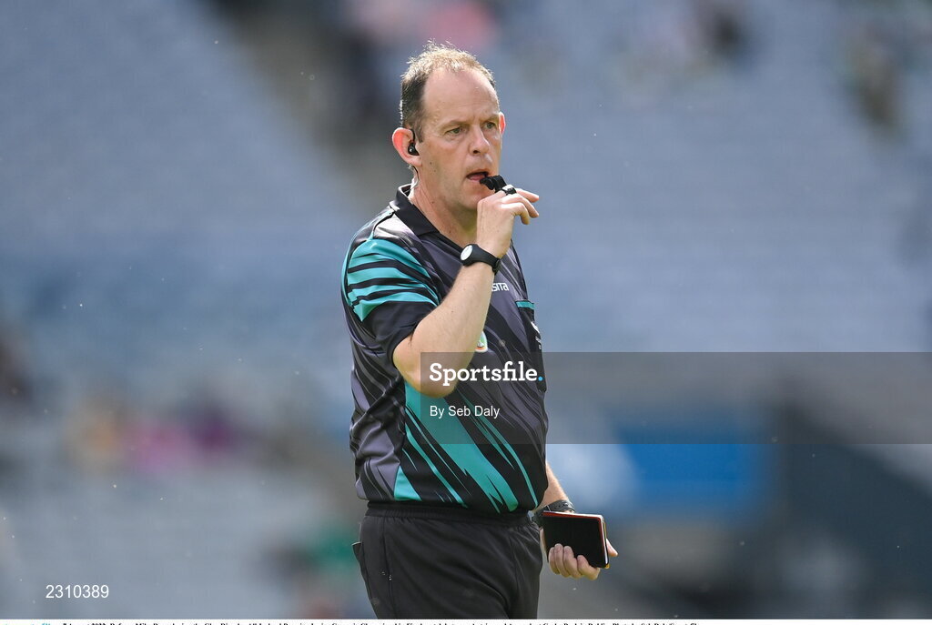 7 August 2022; Referee Mike Ryan during the Glen Dimplex All-Ireland Premier Junior Camogie Championship Final match between Antrim and Armagh at Croke Park in Dublin. Photo by Seb Daly/Sportsfile