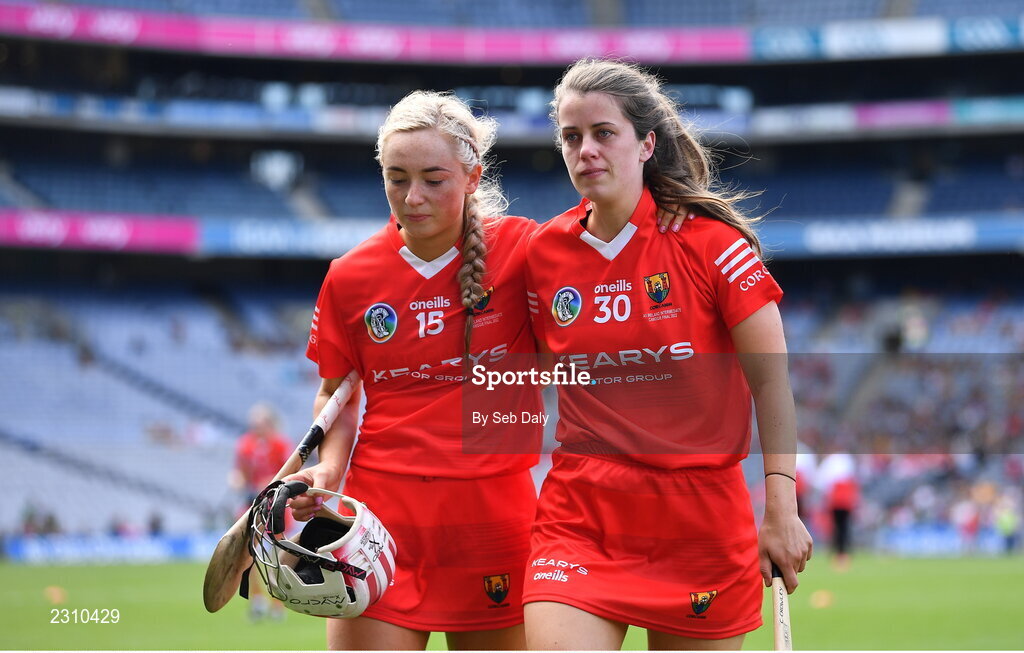 7 August 2022; Cliona O’Callaghan, left, and Finola Neville of Cork after their side's defeat in the Glen Dimplex All-Ireland Intermediate Camogie Championship Final match between Cork and Galway at Croke Park in Dublin. Photo by Seb Daly/Sportsfile