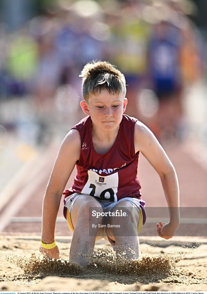 13 August 2022; JJ Roche from Newport, Tipperary, competes in the boys long jump U12 & O10 during the Aldi Community Games National Track and Field Finals that attract over 2,000 children to SETU Carlow Sports Campus in Carlow. Photo by Sam Barnes/Sportsfile