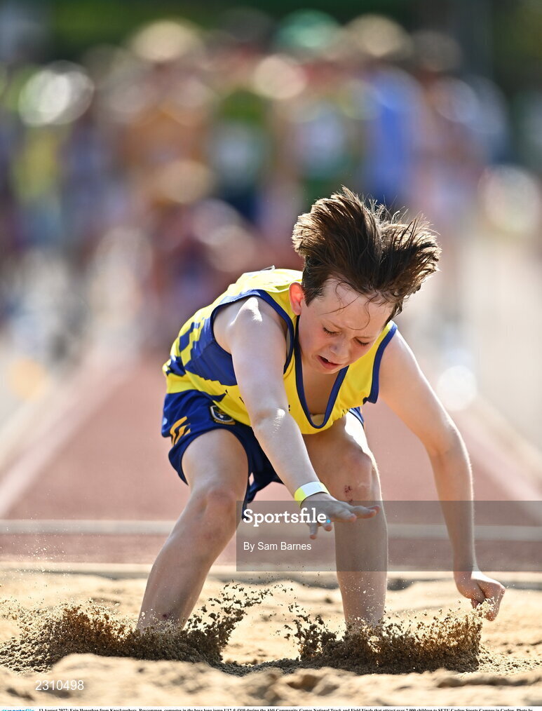 13 August 2022; Eoin Heneghan from Knockroghery, Roscommon, competes in the boys long jump U12 & O10 during the Aldi Community Games National Track and Field Finals that attract over 2,000 children to SETU Carlow Sports Campus in Carlow. Photo by Sam Barnes/Sportsfile