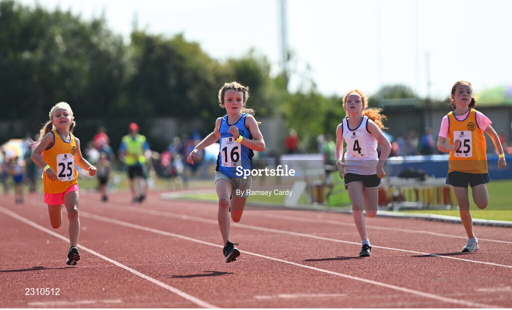 13 August 2022; Sadhbh Quinn, from Dalkey, Dublin, on her way to winning the girls 80m U8 & O6 during the Aldi Community Games National Track and Field Finals that attract over 2,000 children to SETU Carlow Sports Campus in Carlow. Photo by Ramsey Cardy/Sportsfile