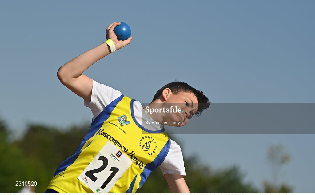 13 August 2022; Peter Walsh, from Kiltoom-Cam, Roscommon, competing in the boys shot put u14 & o12 during the Aldi Community Games National Track and Field Finals that attract over 2,000 children to SETU Carlow Sports Campus in Carlow. Photo by Ramsey Cardy/Sportsfile