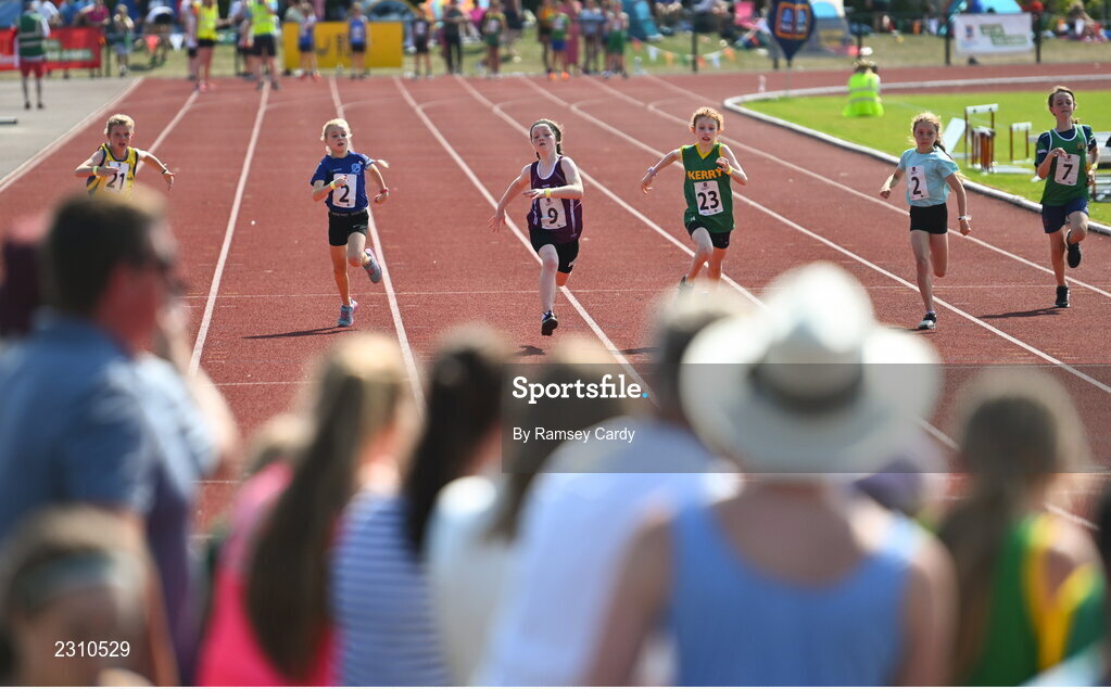 13 August 2022; Amelia Henry, from Ballinderreen, Galway, on her way to winning the girls 100m U10 & O8 during the Aldi Community Games National Track and Field Finals that attract over 2,000 children to SETU Carlow Sports Campus in Carlow. Photo by Ramsey Cardy/Sportsfile