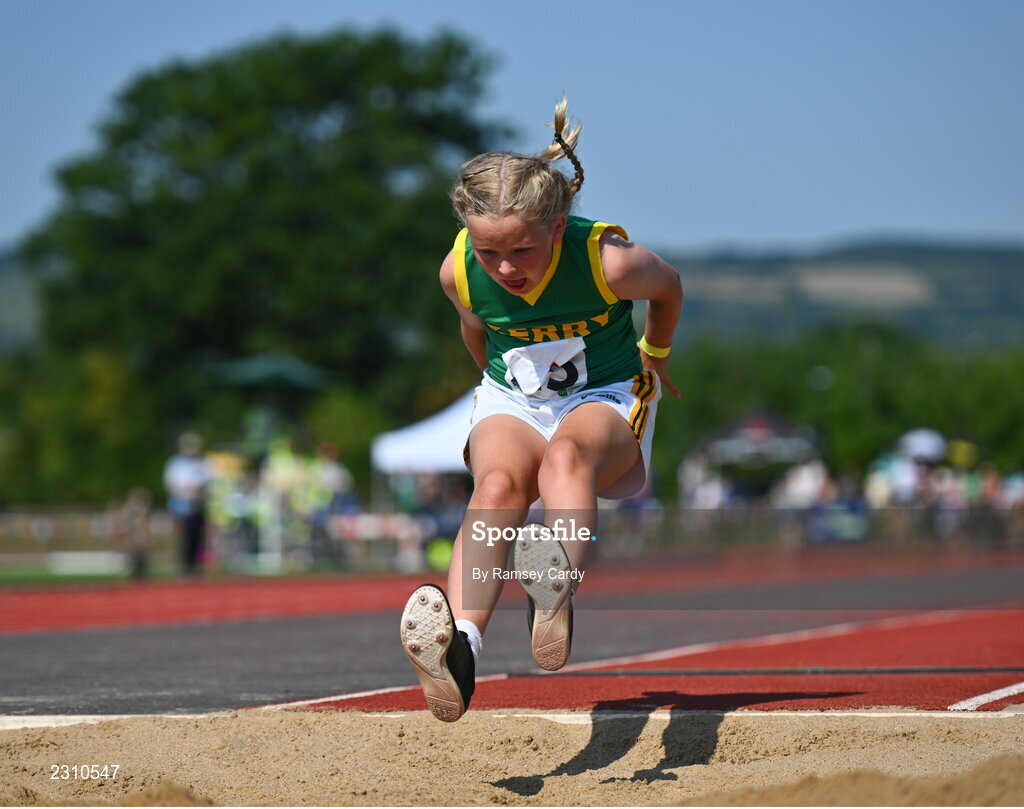 13 August 2022; Ruby Boyle, from Ballyduff, Kerry, competing in the girls long jump u12 & o10 during the Aldi Community Games National Track and Field Finals that attract over 2,000 children to SETU Carlow Sports Campus in Carlow. Photo by Ramsey Cardy/Sportsfile