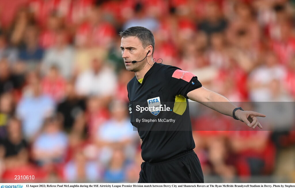 12 August 2022; Referee Paul McLaughlin during the SSE Airtricity League Premier Division match between Derry City and Shamrock Rovers at The Ryan McBride Brandywell Stadium in Derry. Photo by Stephen McCarthy/Sportsfile
