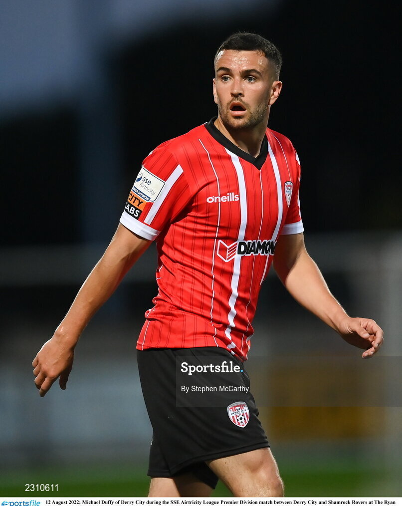12 August 2022; Michael Duffy of Derry City during the SSE Airtricity League Premier Division match between Derry City and Shamrock Rovers at The Ryan McBride Brandywell Stadium in Derry. Photo by Stephen McCarthy/Sportsfile