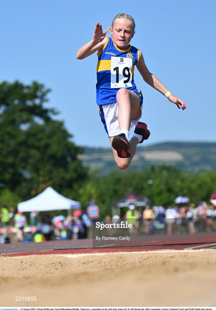 13 August 2022; Triona Heffernan, from Boherlahan-Dualla, Tipperary, competing in the girls long jump u12 & o10 during the Aldi Community Games National Track and Field Finals that attract over 2,000 children to SETU Carlow Sports Campus in Carlow. Photo by Ramsey Cardy/Sportsfile