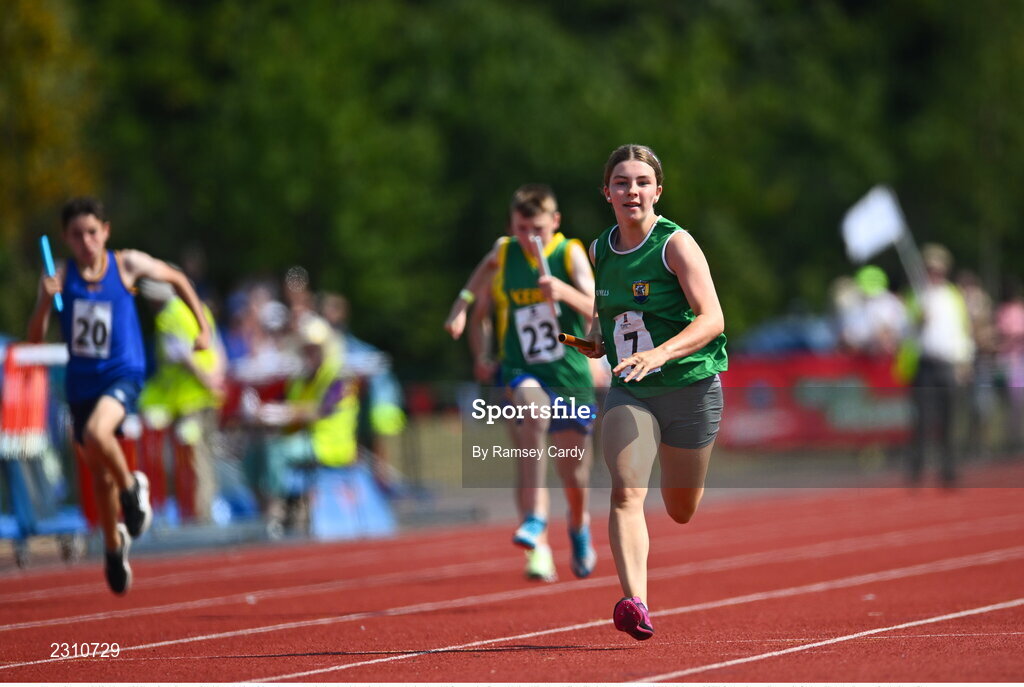 13 August 2022; Megan O’ Shea, from Crecora-Patrickswell, Limerick, on her way to winning the girls u13 relay race during the Aldi Community Games National Track and Field Finals that attract over 2,000 children to SETU Carlow Sports Campus in Carlow. Photo by Ramsey Cardy/Sportsfile