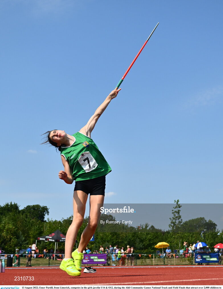 13 August 2022; Emer Purtill, from Limerick, competes in the girls javelin U14 & O12, during the Aldi Community Games National Track and Field Finals that attract over 2,000 children to SETU Carlow Sports Campus in Carlow. Photo by Ramsey Cardy/Sportsfile
