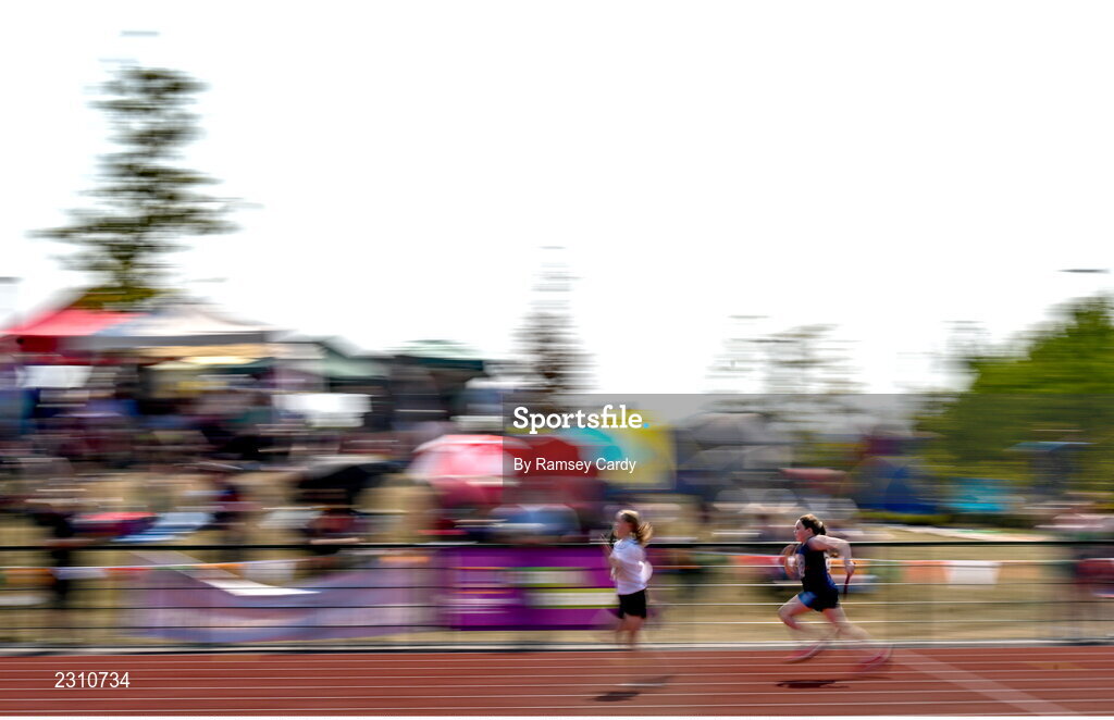 13 August 2022; A general view of action during the girls u12 relay semi-final at the Aldi Community Games National Track and Field Finals that attract over 2,000 children to SETU Carlow Sports Campus in Carlow. Photo by Ramsey Cardy/Sportsfile
