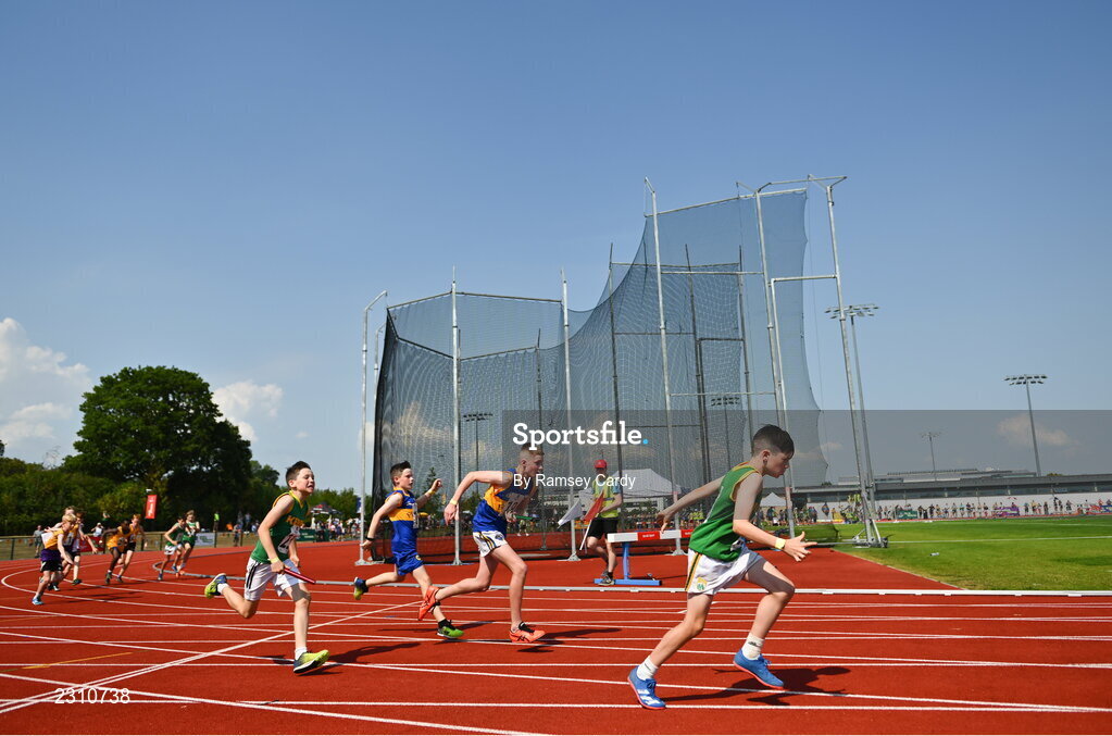 13 August 2022; The Kerry team during the boys u14 4x100m relay semi-final at the Aldi Community Games National Track and Field Finals that attract over 2,000 children to SETU Carlow Sports Campus in Carlow. Photo by Ramsey Cardy/Sportsfile
