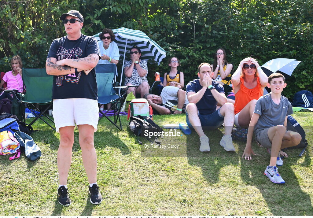 13 August 2022; Spectators react during a girls relay race during the Aldi Community Games National Track and Field Finals that attract over 2,000 children to SETU Carlow Sports Campus in Carlow. Photo by Ramsey Cardy/Sportsfile