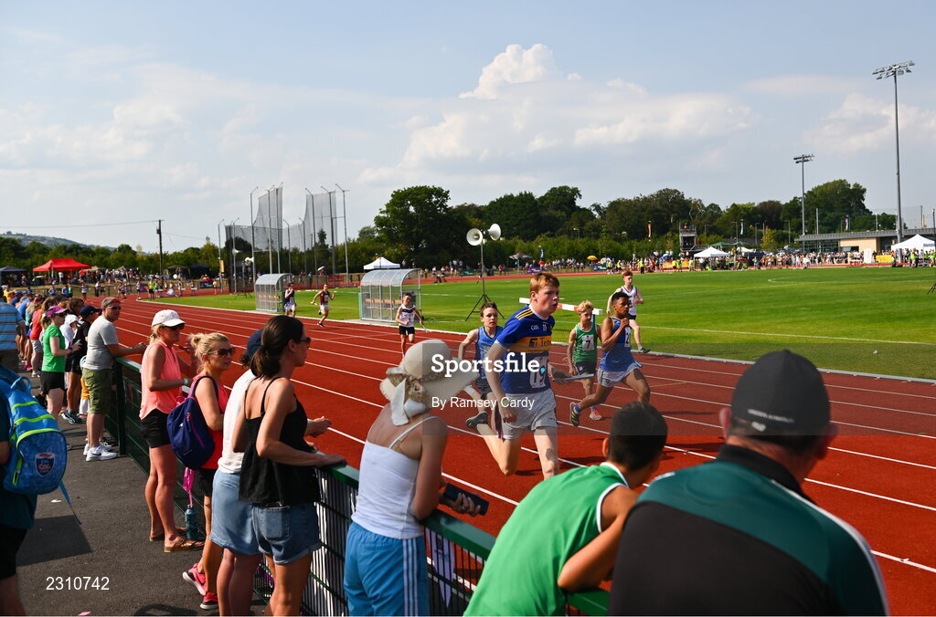 13 August 2022; A general view of action during the boys relays at the Aldi Community Games National Track and Field Finals that attract over 2,000 children to SETU Carlow Sports Campus in Carlow. Photo by Ramsey Cardy/Sportsfile