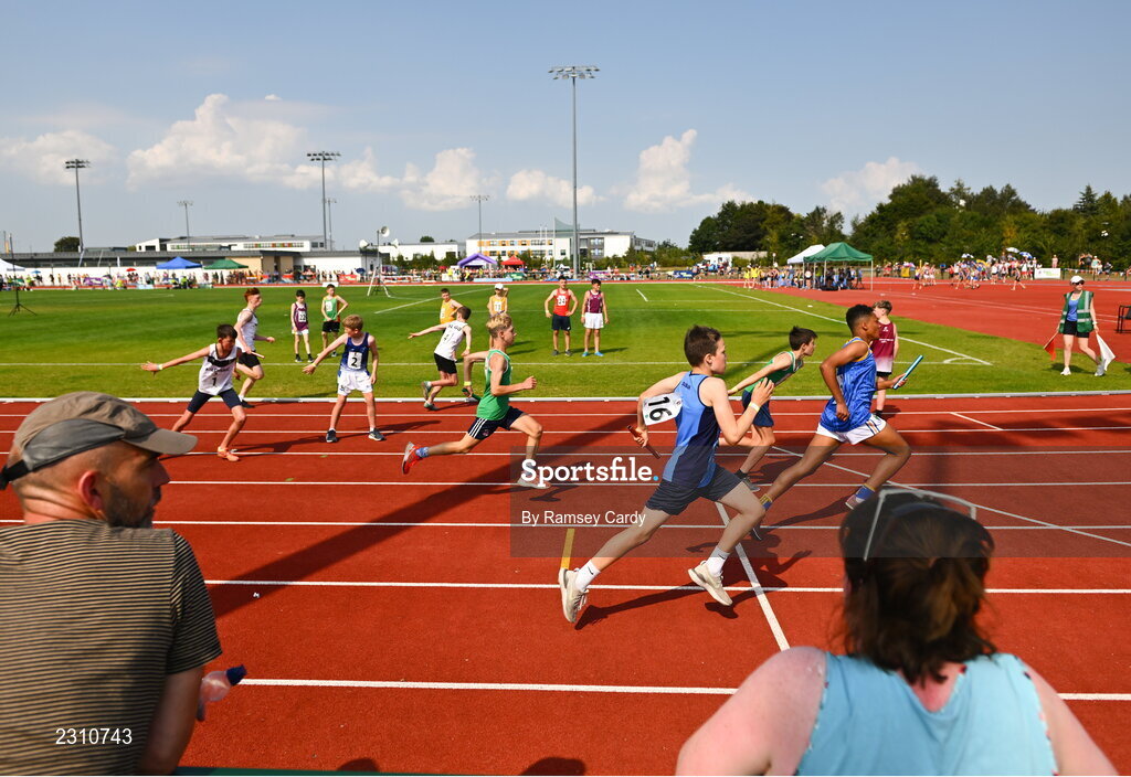 13 August 2022; A general view of action during the boys relays at the Aldi Community Games National Track and Field Finals that attract over 2,000 children to SETU Carlow Sports Campus in Carlow. Photo by Ramsey Cardy/Sportsfile