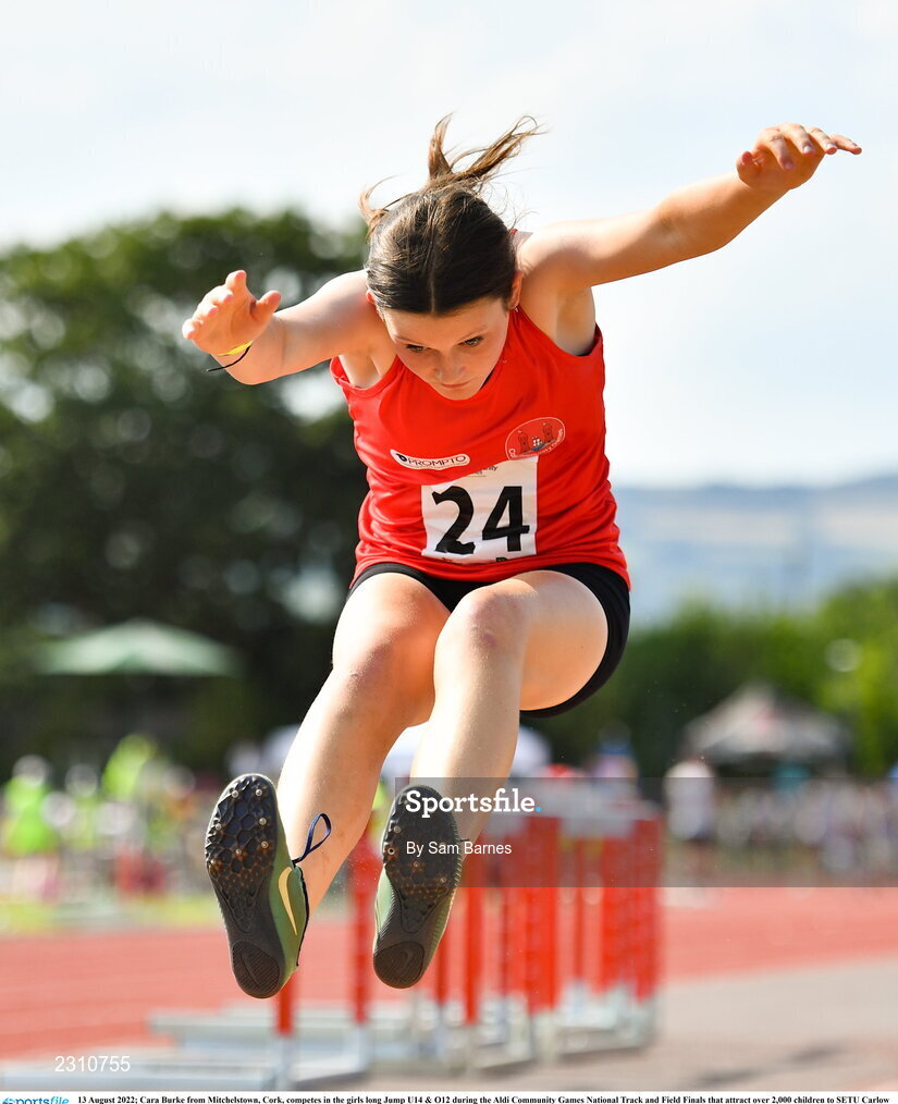 13 August 2022; Cara Burke from Mitchelstown, Cork, competes in the girls long Jump U14 & O12 during the Aldi Community Games National Track and Field Finals that attract over 2,000 children to SETU Carlow Sports Campus in Carlow. Photo by Sam Barnes/Sportsfile