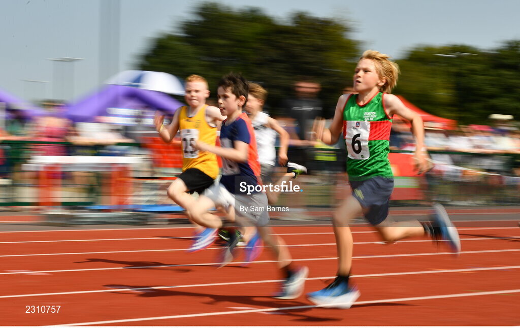 13 August 2022; Donnacha Ronan from Kilmaine, Mayo, right, competing in the boys 200m U10 & O8 during the Aldi Community Games National Track and Field Finals that attract over 2,000 children to SETU Carlow Sports Campus in Carlow. Photo by Sam Barnes/Sportsfile