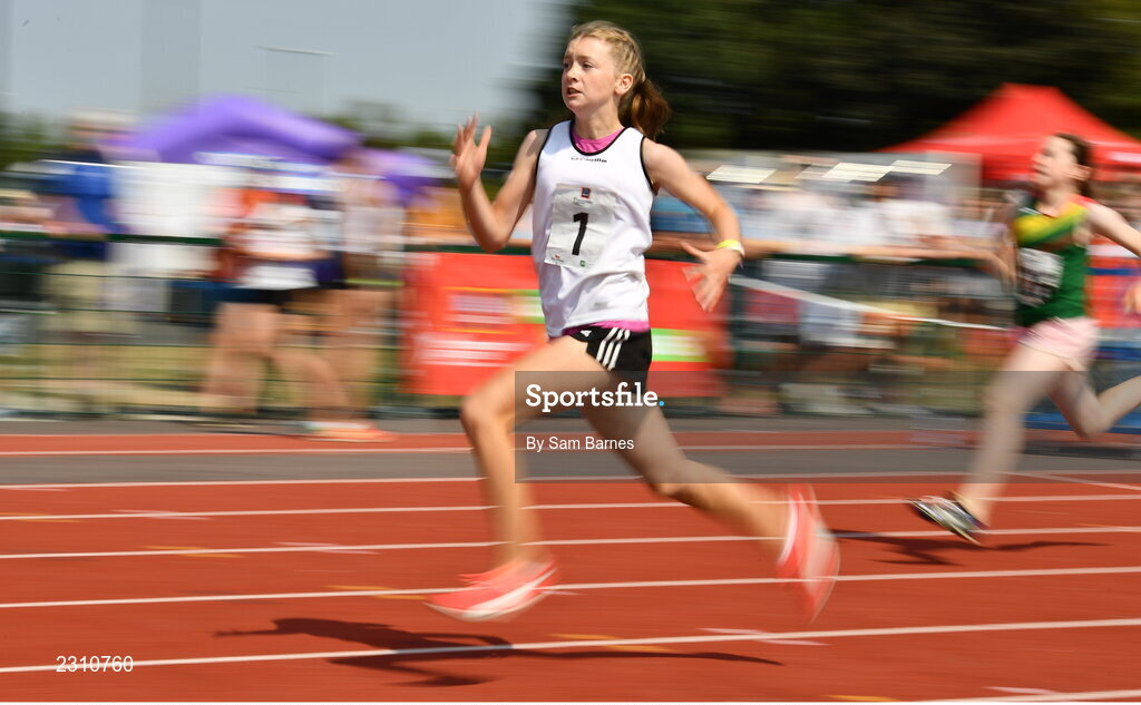 13 August 2022; Olivia Smith from St-Brigids-Newbridge, Kildare, competing in the girls 200m U12 & O10 during the Aldi Community Games National Track and Field Finals that attract over 2,000 children to SETU Carlow Sports Campus in Carlow. Photo by Sam Barnes/Sportsfile