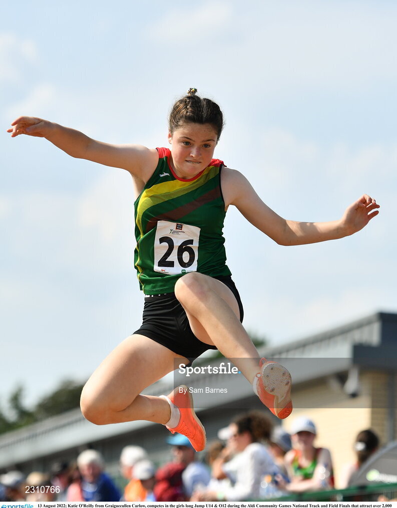 13 August 2022; Katie O'Reilly from Graiguecullen Carlow, competes in the girls long Jump U14 & O12 during the Aldi Community Games National Track and Field Finals that attract over 2,000 children to SETU Carlow Sports Campus in Carlow. Photo by Sam Barnes/Sportsfile
