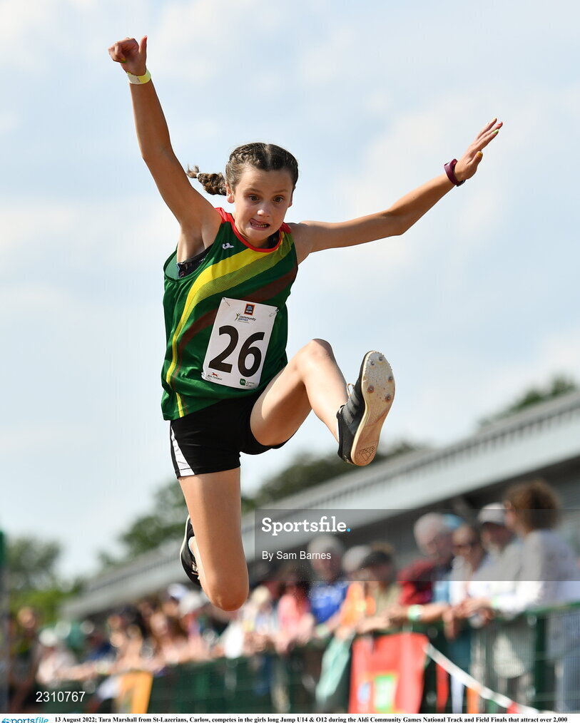 13 August 2022; Tara Marshall from St-Lazerians, Carlow, competes in the girls long Jump U14 & O12 during the Aldi Community Games National Track and Field Finals that attract over 2,000 children to SETU Carlow Sports Campus in Carlow. Photo by Sam Barnes/Sportsfile