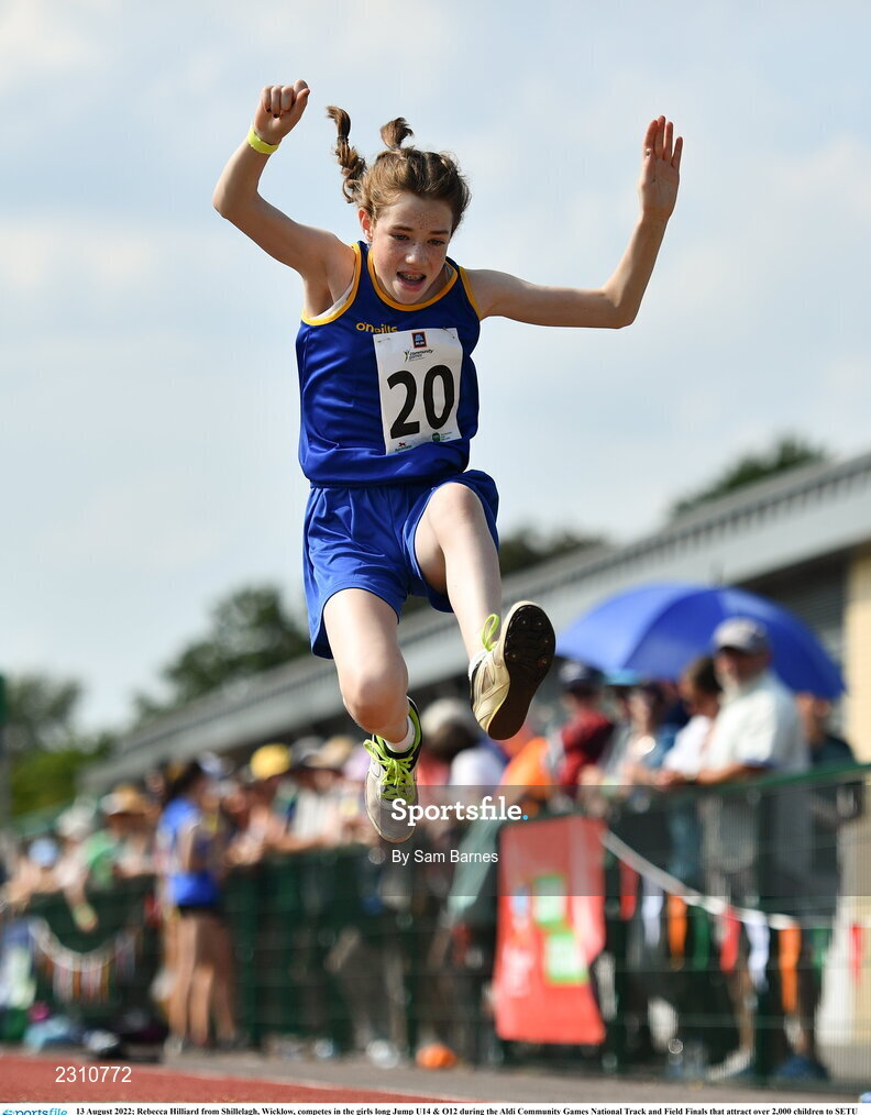 13 August 2022; Rebecca Hilliard from Shillelagh, Wicklow, competes in the girls long Jump U14 & O12 during the Aldi Community Games National Track and Field Finals that attract over 2,000 children to SETU Carlow Sports Campus in Carlow. Photo by Sam Barnes/Sportsfile