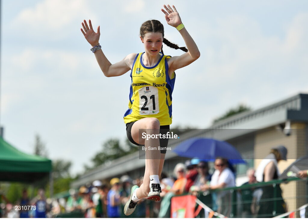13 August 2022; Alice Farrell from Knockroghery, Roscommon, competes in the girls long Jump U14 & O12 during the Aldi Community Games National Track and Field Finals that attract over 2,000 children to SETU Carlow Sports Campus in Carlow. Photo by Sam Barnes/Sportsfile
