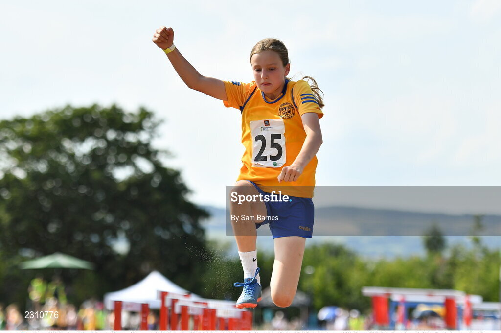 13 August 2022; Anna Donnelly from Ballynacally-Lissycasey, Clare, competes in the girls long Jump U14 & O12 during the Aldi Community Games National Track and Field Finals that attract over 2,000 children to SETU Carlow Sports Campus in Carlow. Photo by Sam Barnes/Sportsfile