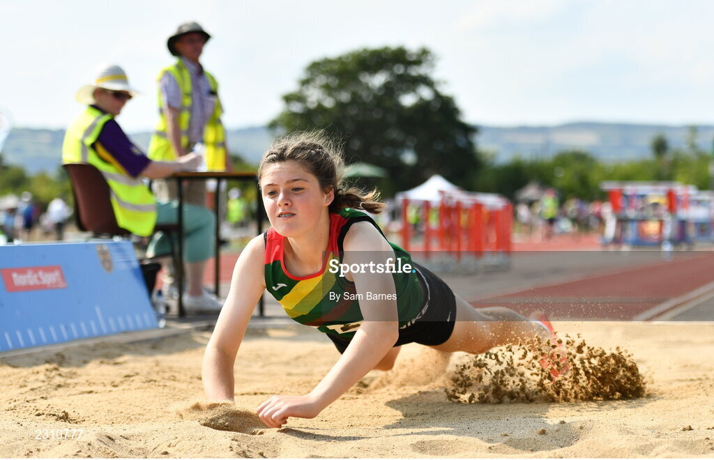 13 August 2022; Katie O'Reilly from Graiguecullen, Carlow, competes in the girls long Jump U14 & O12 during the Aldi Community Games National Track and Field Finals that attract over 2,000 children to SETU Carlow Sports Campus in Carlow. Photo by Sam Barnes/Sportsfile