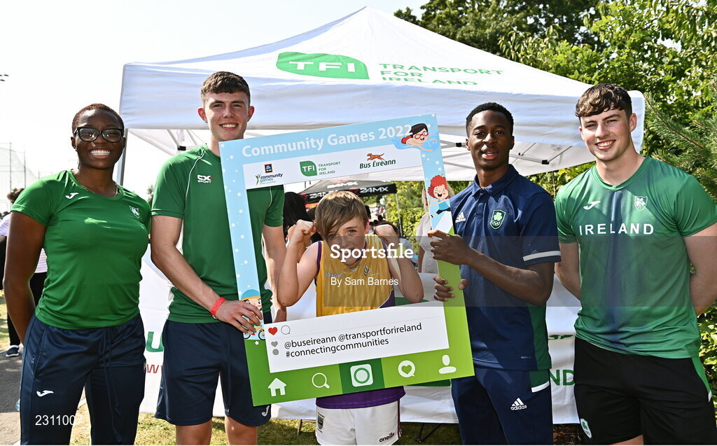 13 August 2022; Community games ambassadors, from left, Adeyemi Talabi, Oisin Joyce, Jesse Osas and Conor Cusack, with Jimmy Kennedy from Piercestown-Murrinstown, Wexford, during the Aldi Community Games National Track and Field Finals that attract over 2,000 children to SETU Carlow Sports Campus in Carlow. Photo by Sam Barnes/Sportsfile