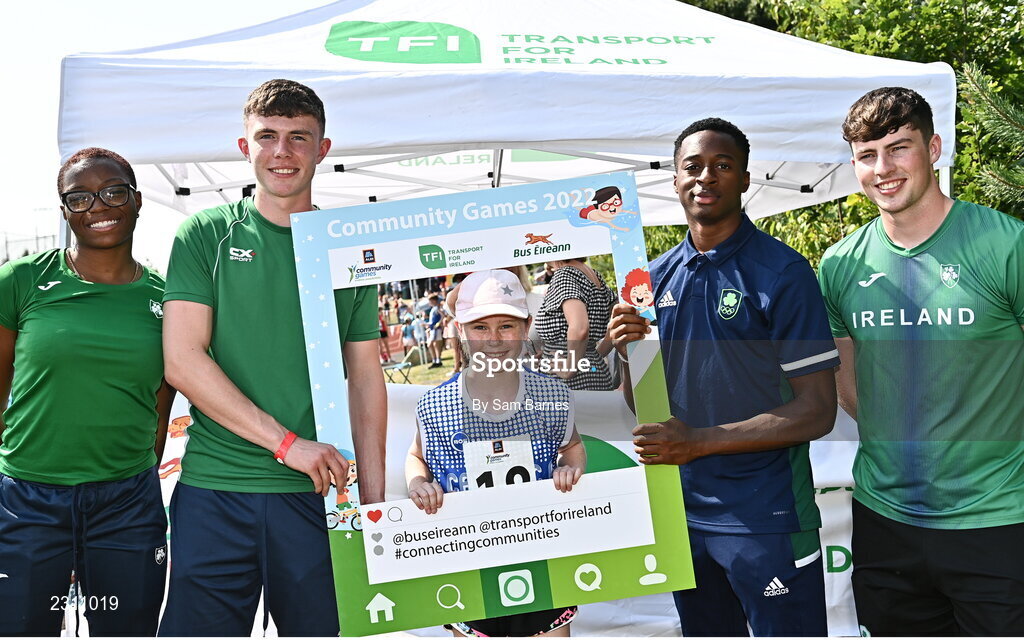 13 August 2022; Community games ambassadors, from left, Adeyemi Talabi, Oisin Joyce, Jesse Osas and Conor Cusack, with Sarah-Kate Liggan from Cavan during the Aldi Community Games National Track and Field Finals that attract over 2,000 children to SETU Carlow Sports Campus in Carlow. Photo by Sam Barnes/Sportsfile
