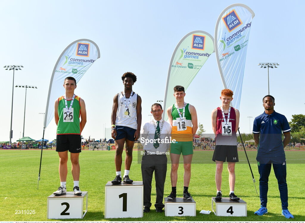 13 August 2022; Community Games President Gerry McGuinness, centre, and Community Games ambassador Jesse Osas, right, with boys 100m U14 & O12 medallists, Kenneth Kalu from Cornageeha, Sligo, gold, Kiegan Lawlor from Bennekerry-Tinryland, Carlow, silver, Cian McNamee from Rhode, Offaly, bronze, and Finn Roddy from Castlepollard-Finea, Westmeath, fourth, during the Aldi Community Games National Track and Field Finals that attract over 2,000 children to SETU Carlow Sports Campus in Carlow. Photo by Sam Barnes/Sportsfile