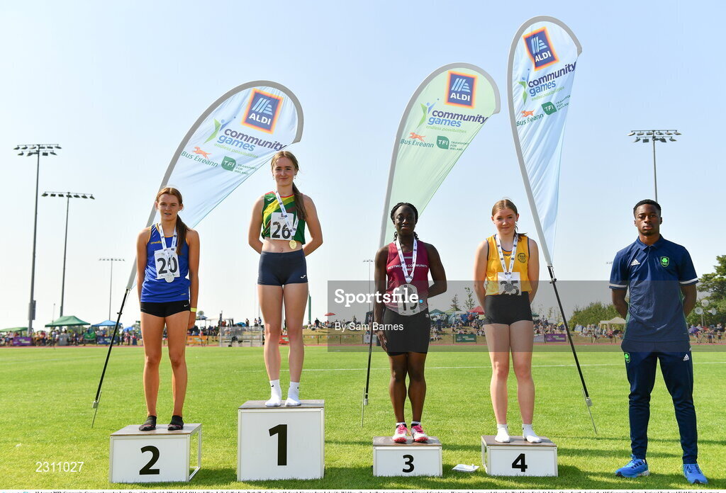 13 August 2022; Community Games ambassador Jesse Osas, right, with girls 100m U16 & O14 medallists, Leila Colfer from Rathvilly, Carlow, gold, Sarah Kiernan from Lakeside, Wicklow, silver, Ayulley Amentorge from Kinnegad-Coralstown, Westmeath, bronze, and Alexandra Ward from Ennis-St-Johns, Clare, fourth, during the Aldi Community Games National Track and Field Finals that attract over 2,000 children to SETU Carlow Sports Campus in Carlow. Photo by Sam Barnes/Sportsfile