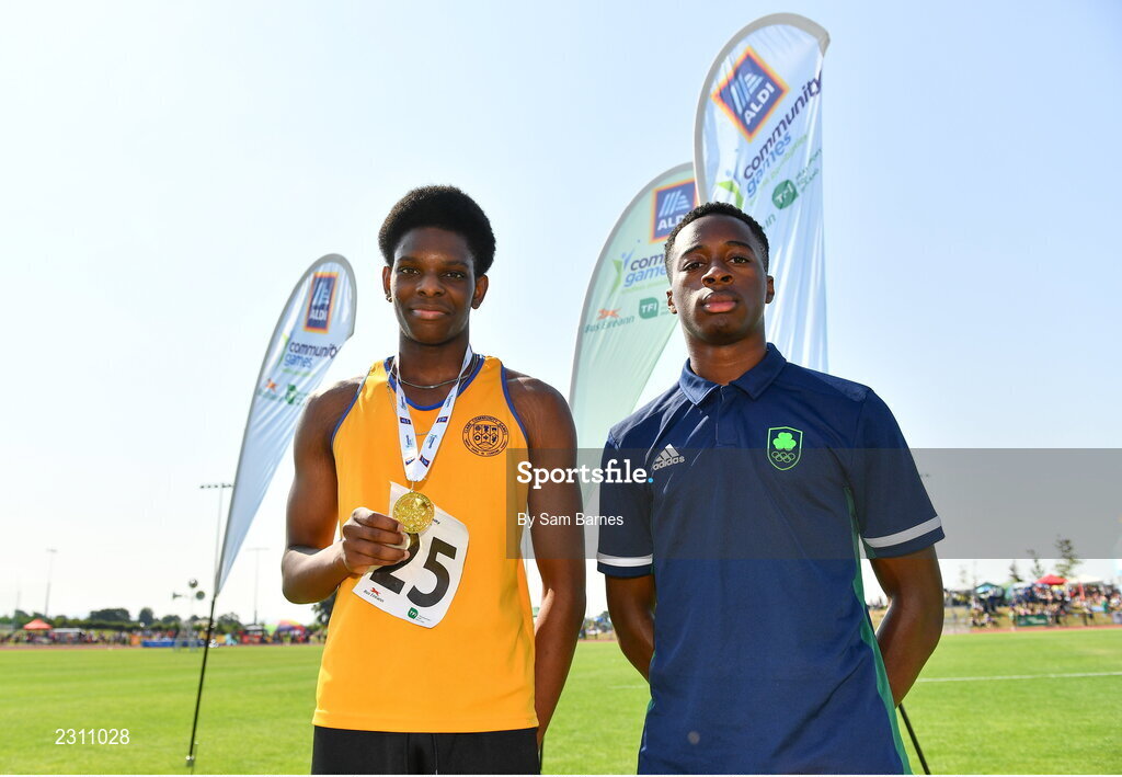 13 August 2022; Community Games ambassador Jesse Osas, right, with boys 100m U16 & O14 gold medallist Sylvester Onwudiwe from Ennis-St-Johns, Clare, during the Aldi Community Games National Track and Field Finals that attract over 2,000 children to SETU Carlow Sports Campus in Carlow. Photo by Sam Barnes/Sportsfile