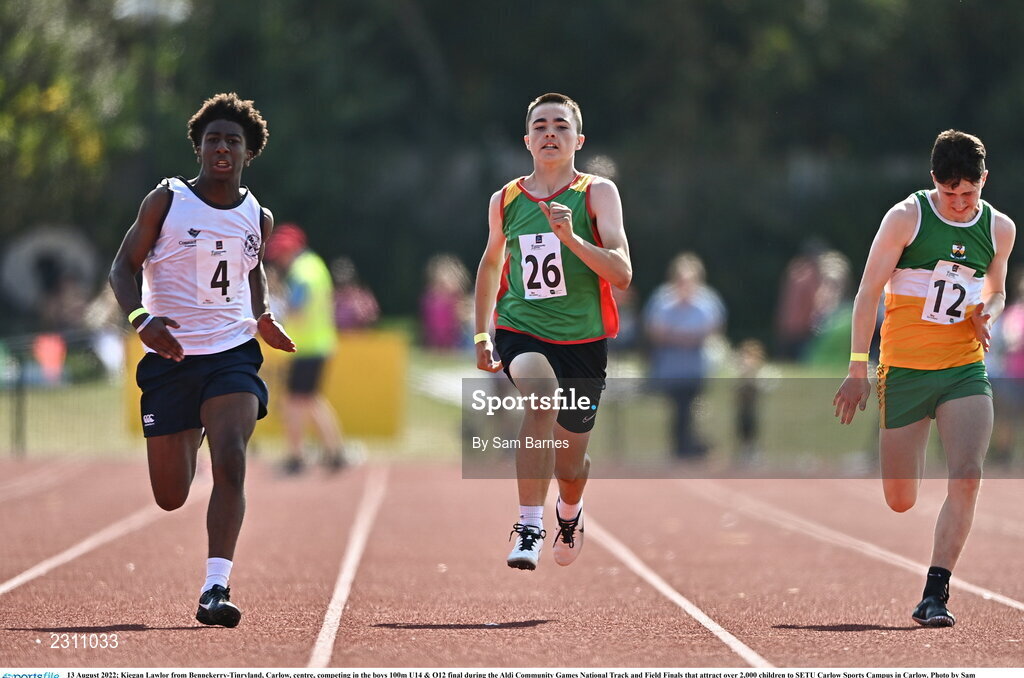 13 August 2022; Kiegan Lawlor from Bennekerry-Tinryland, Carlow, centre, competing in the boys 100m U14 & O12 final during the Aldi Community Games National Track and Field Finals that attract over 2,000 children to SETU Carlow Sports Campus in Carlow. Photo by Sam Barnes/Sportsfile