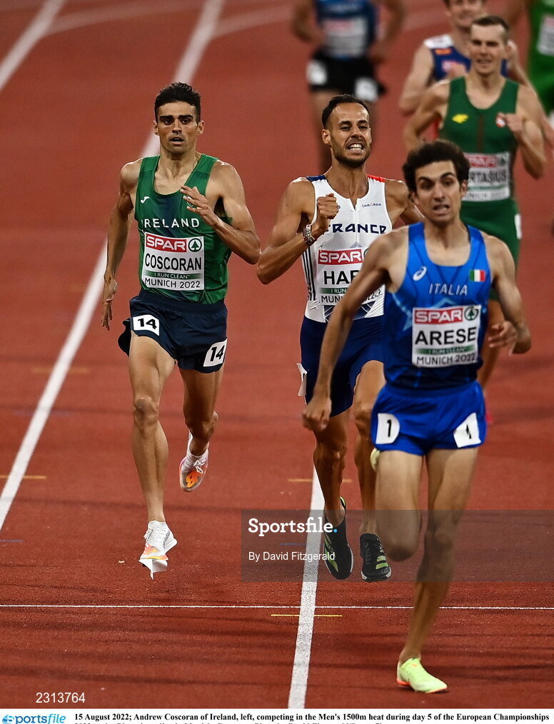 15 August 2022; Andrew Coscoran of Ireland, left, competing in the Men's 1500m heat during day 5 of the European Championships 2022 at the Olympiastadion in Munich, Germany. Photo by David Fitzgerald/Sportsfile