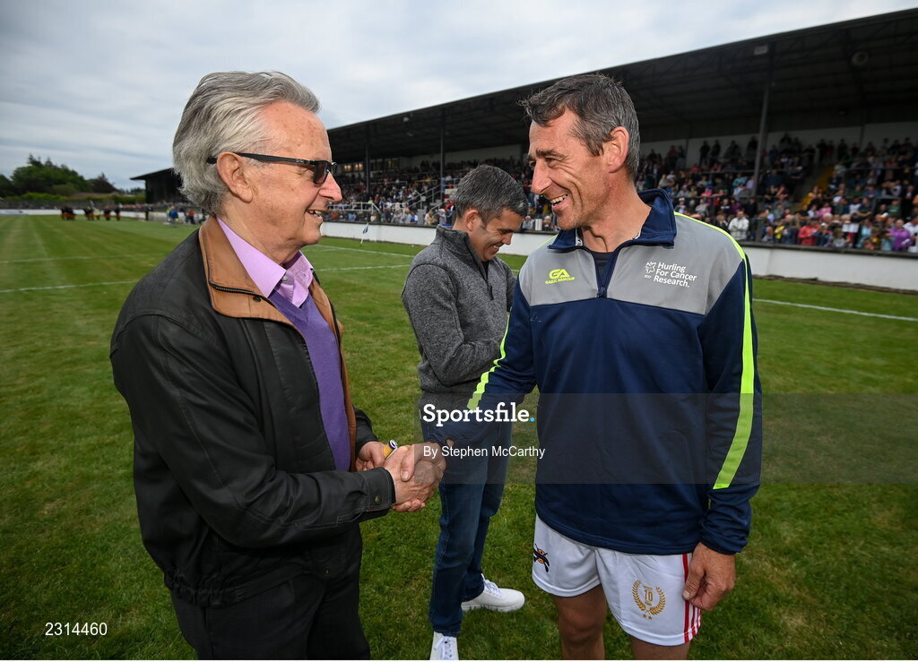 16 August 2022; Horse racing trainer Jim Bolger and jockey Davy Russell during the Hurling for Cancer Research 2022 match at St Conleth's Park in Newbridge, Kildare. Photo by Stephen McCarthy/Sportsfile